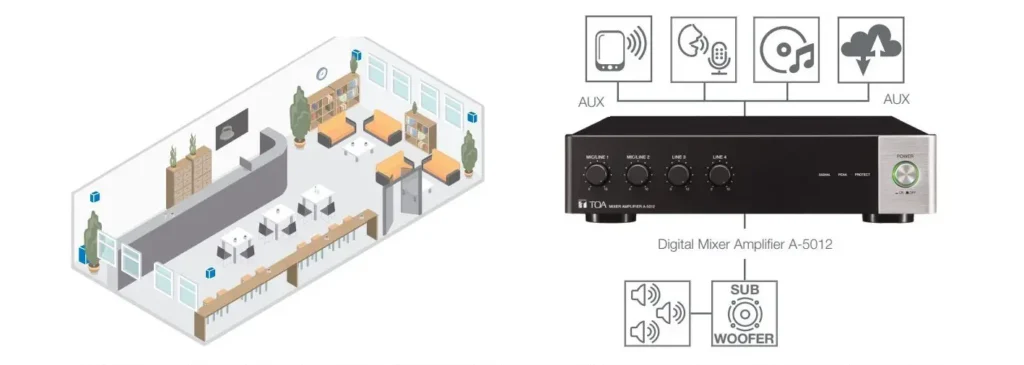 میکسر آمپلی فایر دیجیتال مدل A-5012 برند TOA و سیستم بلندگوی (ساب و ست لایت) BS-301 می باشد. این پکیچ شامل یک ساب ووفر و چهار بلندگوی کوچک، که می تواند به طور هماهنگ در کافه استفاده شوند. برای خرید اسپیکر کافه سری BS از برند TOA یک گزینه اقتصادی و مناسب می باشد.